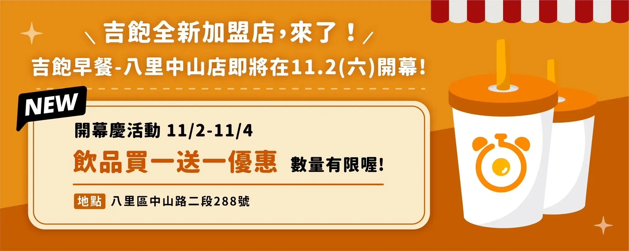 吉飽全新加盟店即將開幕啦! 八里中山店將在 11月2日(週六) 正式開幕,歡迎您來體驗我們現做的美味早餐,開啟美好一天的開始!
